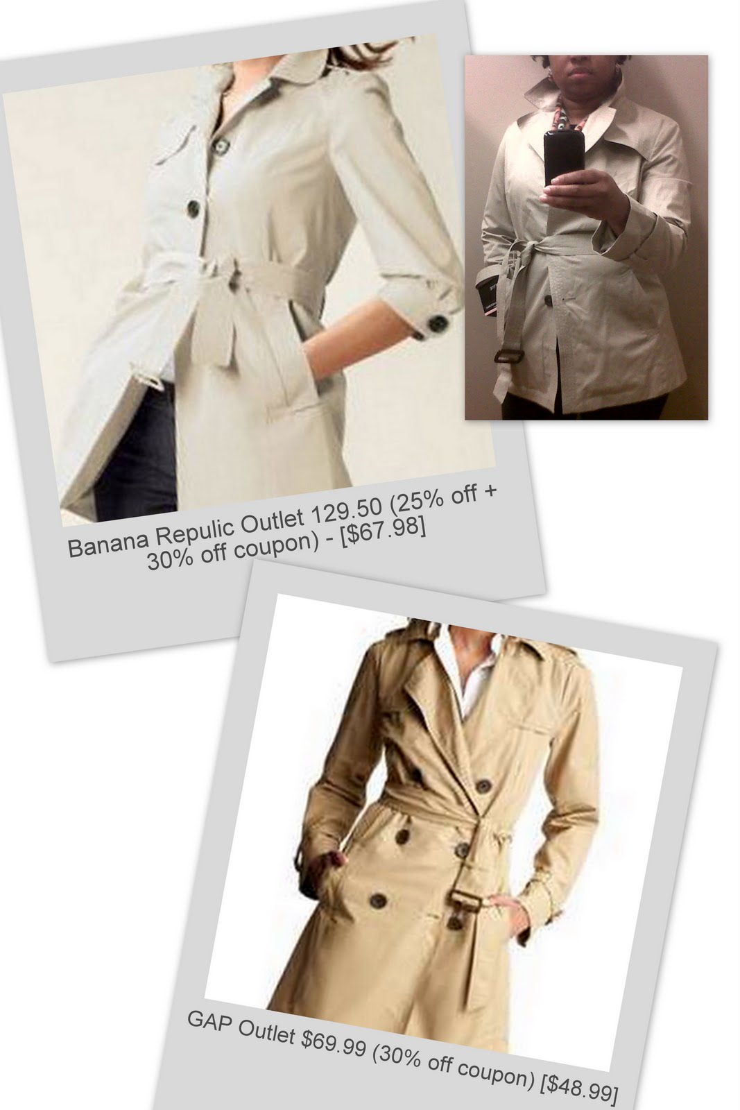 I have a black trench that I purchased a few years ago, and while it's still in style, I really wanted a khaki trench that I can wear for spring and summer. I headed out to Tanger Outlets in Mebane, NC over the weekend with 30% off coupons for the Banana Republic Outlet and Gap Outlet stores. I really liked the Banana Republic trench, it was lined and was the perfect length but the color was lighter that what I wanted. The GAP trench was just okay, it came in some bright colors for the spring and summer, but it was just too long, wasn't lined, and the pockets were low, taking out the option to get it hemmed. Both were a little above the price point I wanted to spend. So after consulting with my friend Kei, I decided to pass and keep on looking . . .
